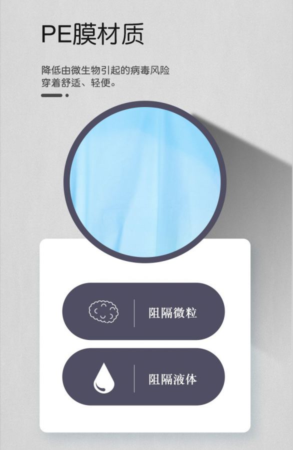 產(chǎn)品性能:長袖,大拇指袖口、降低由微生物引起的病毒風險、穿著舒適,輕便,防水。